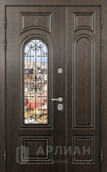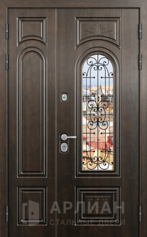 Двустворчатая входная дверь в частный дом со стеклом и решеткой №18