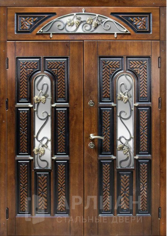 Входная двустворчатая дверь со стеклом и ковкой в загородный дом №14