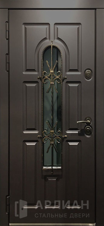 Кованая арочная входная дверь со стеклом и ковкой №69